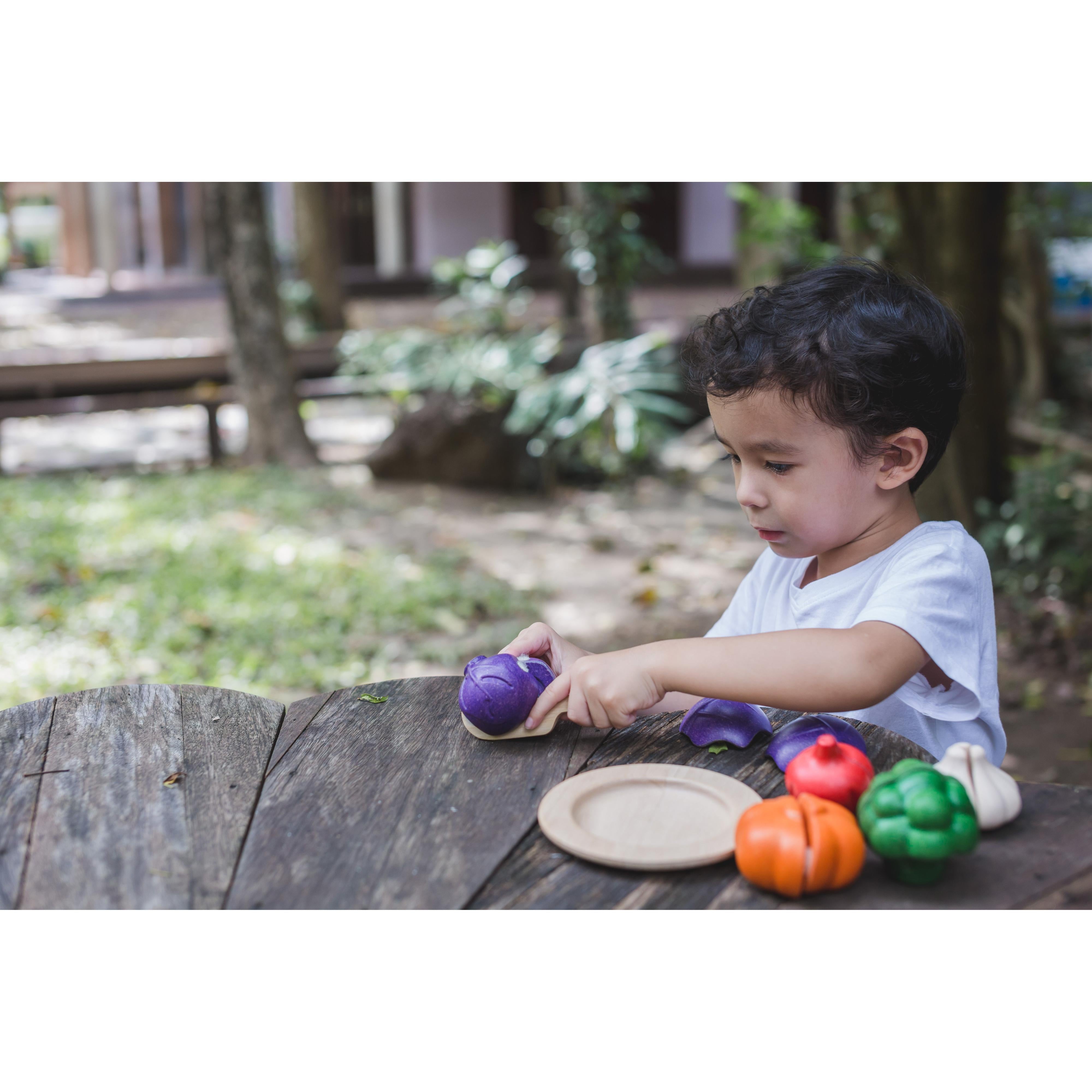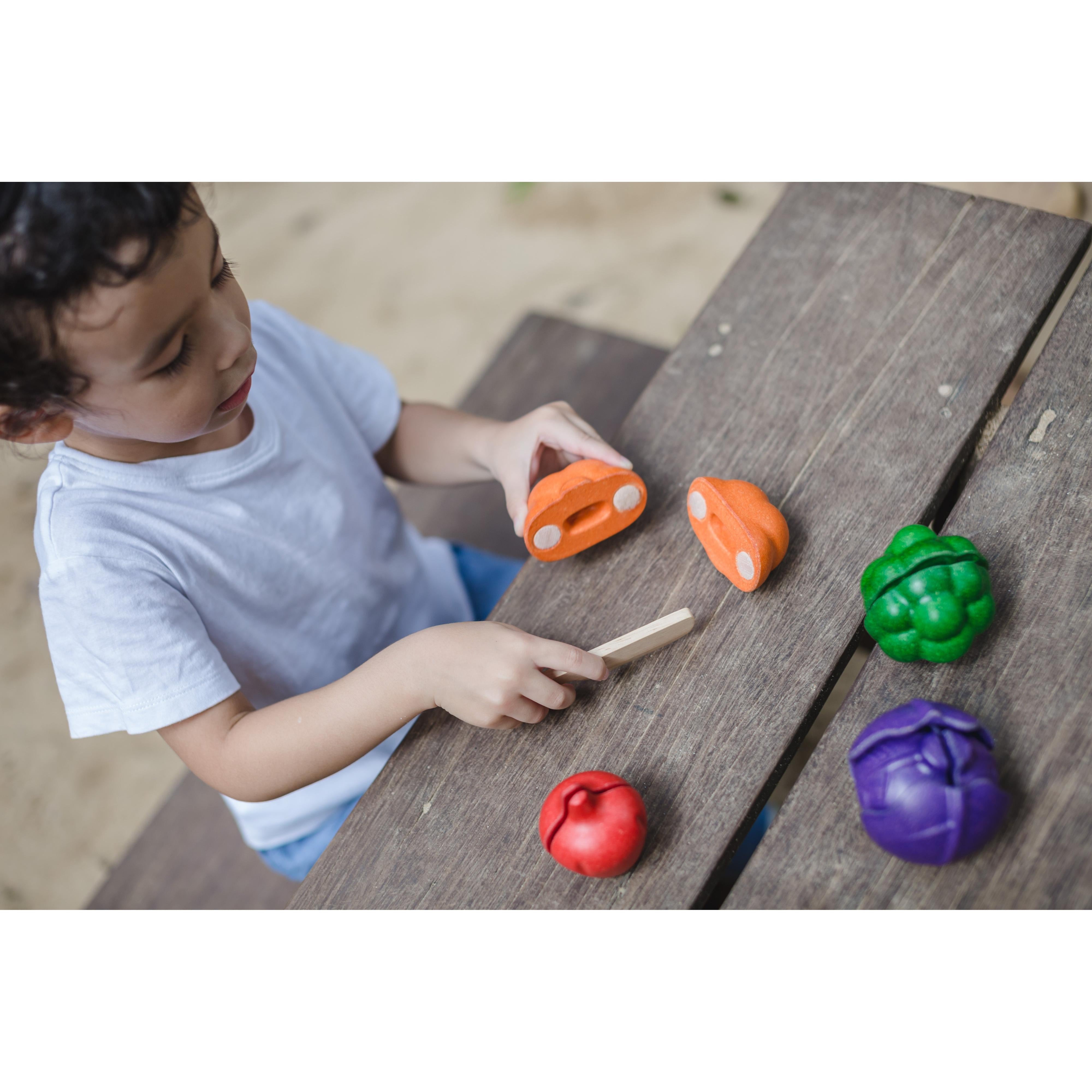 The 5-Color Veggie Set comes with a knife and 5 sliceable veggies: broccoli, bell pepper, pumpkin, garlic, and red cabbage. Children can learn about benefits of each colored vegetable. Tactile details offer realistic play.