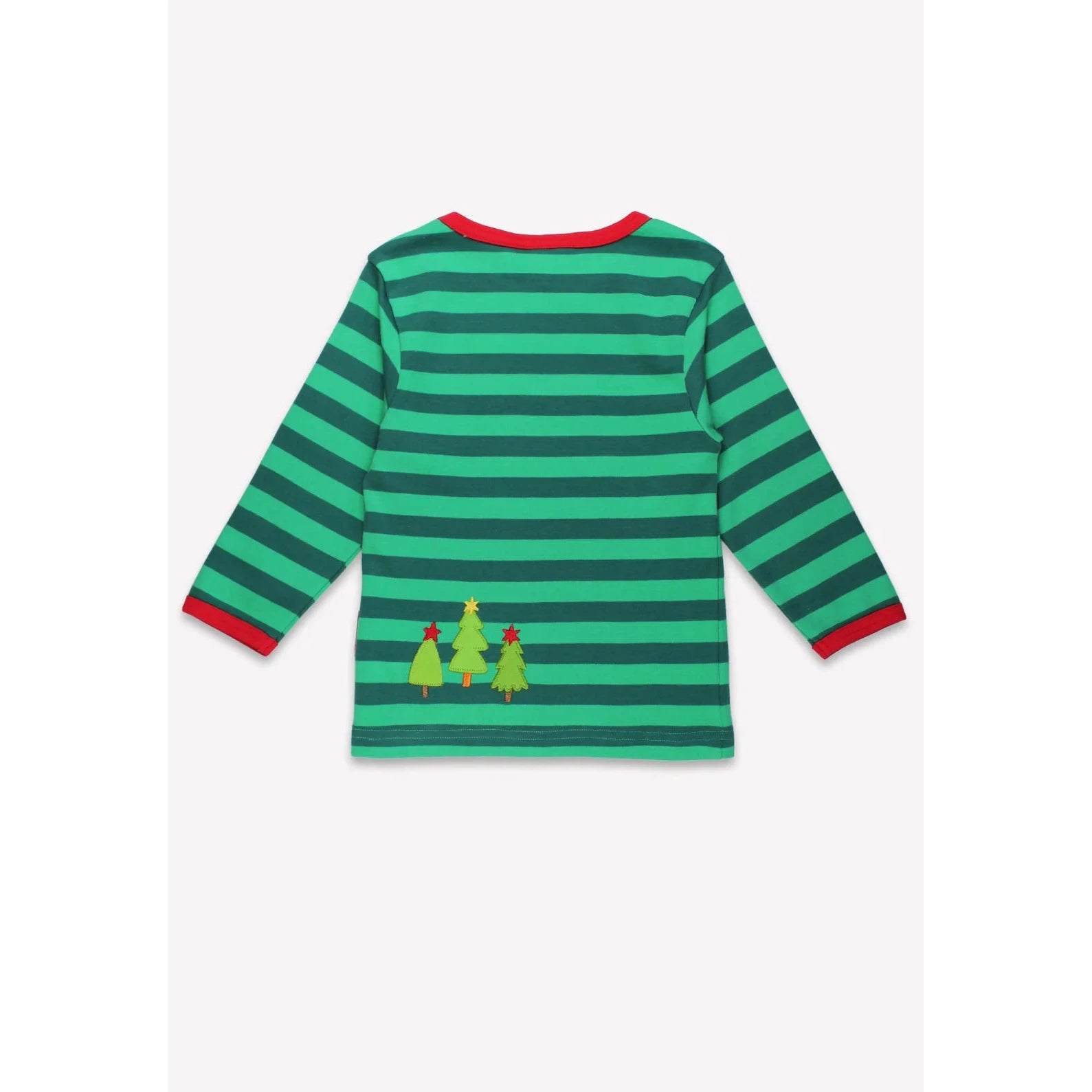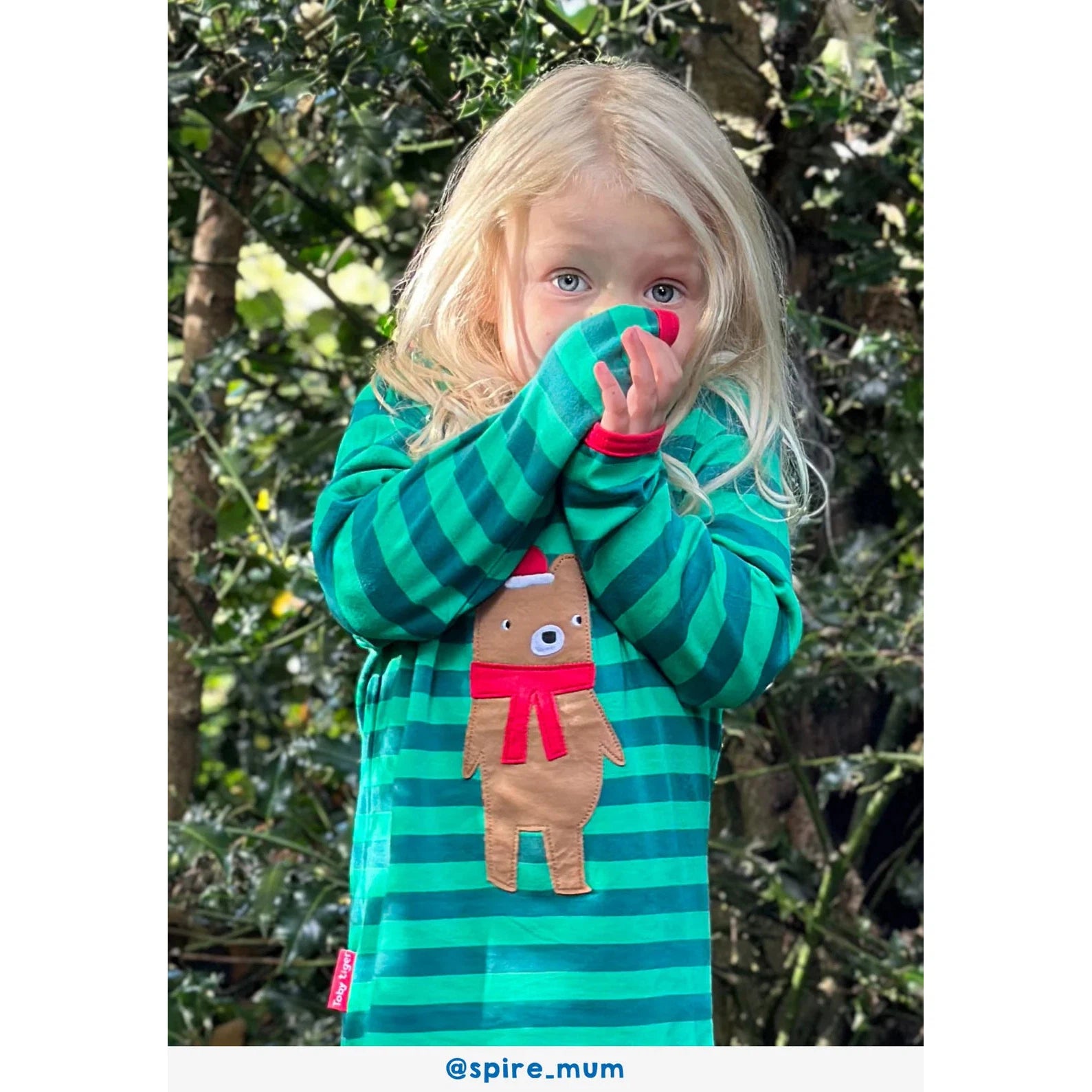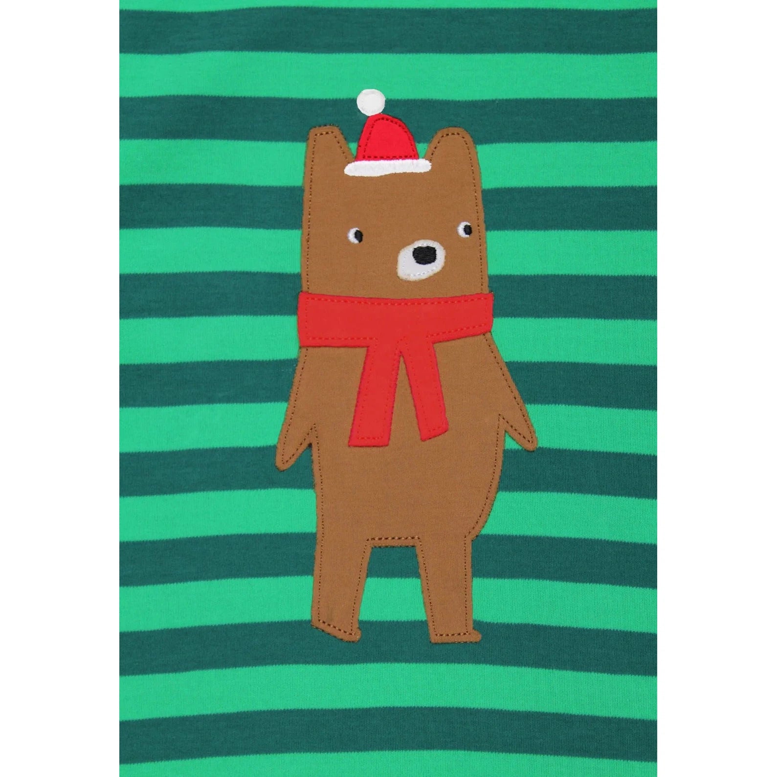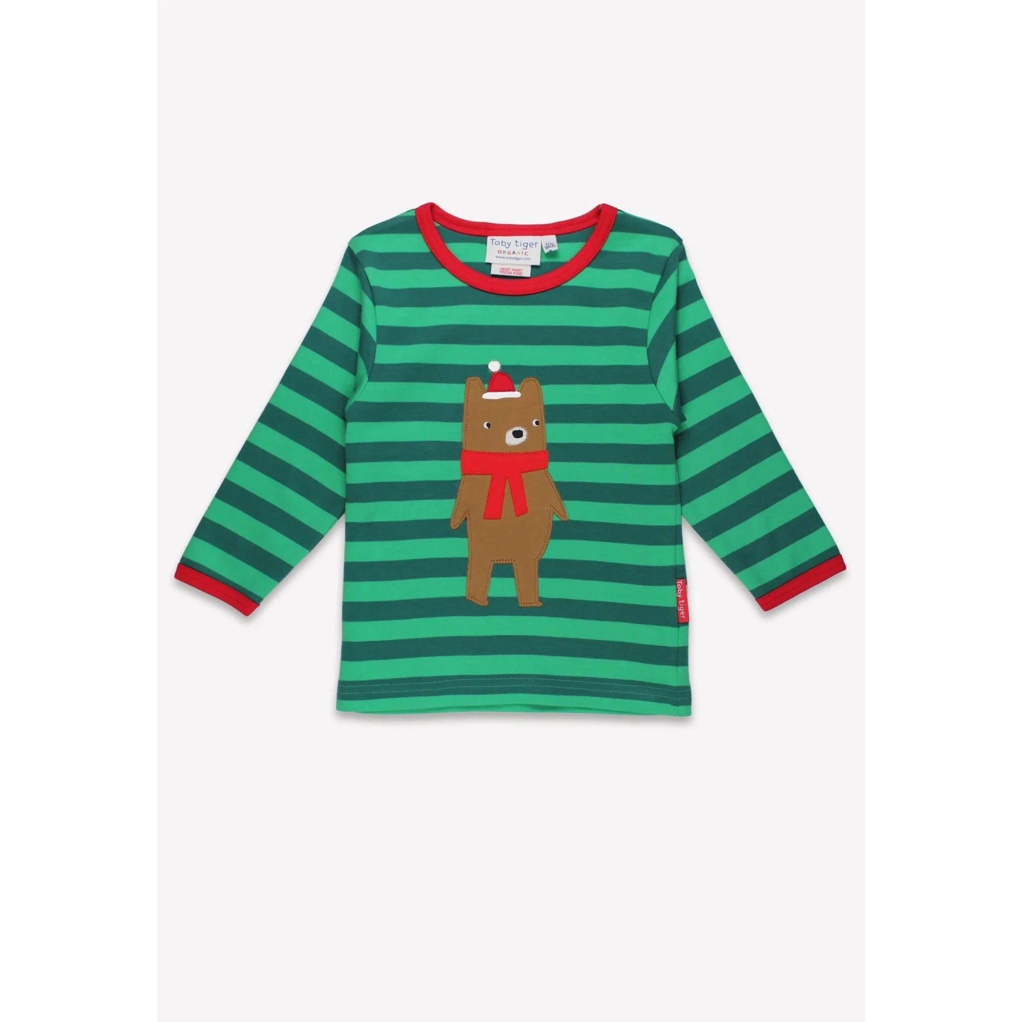 Get into the Christmas spirit with our Organic Christmas Bear Applique Long-Sleeved T-Shirt! This festive shirt features a cute bear wearing a winter hat and scarf. The dark and light green stripes with red trim add an extra touch of Christmas cheer. Made with organic materials, it's a great choice for the environment and your little one.