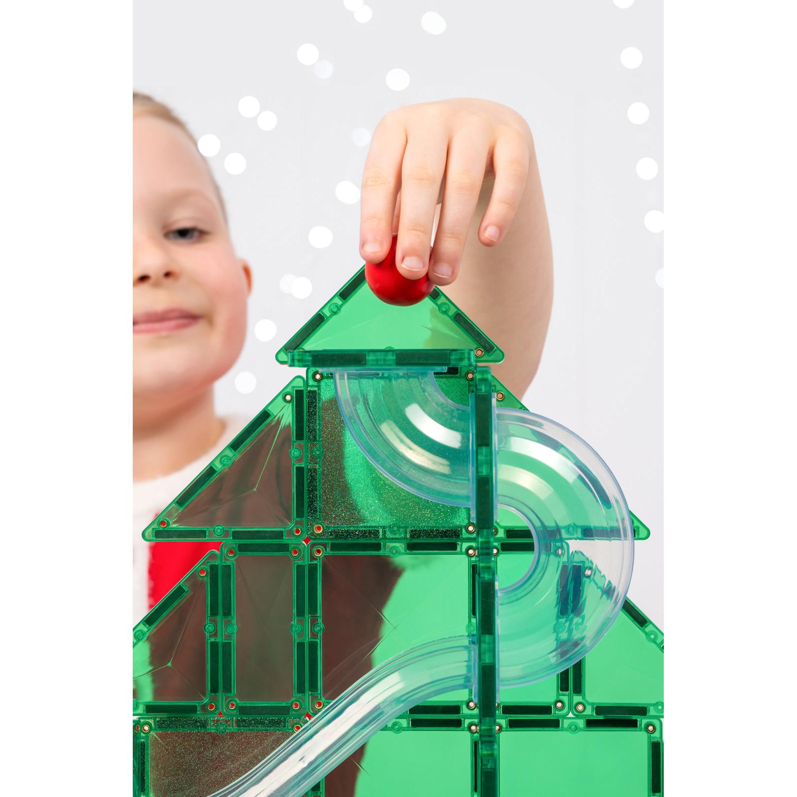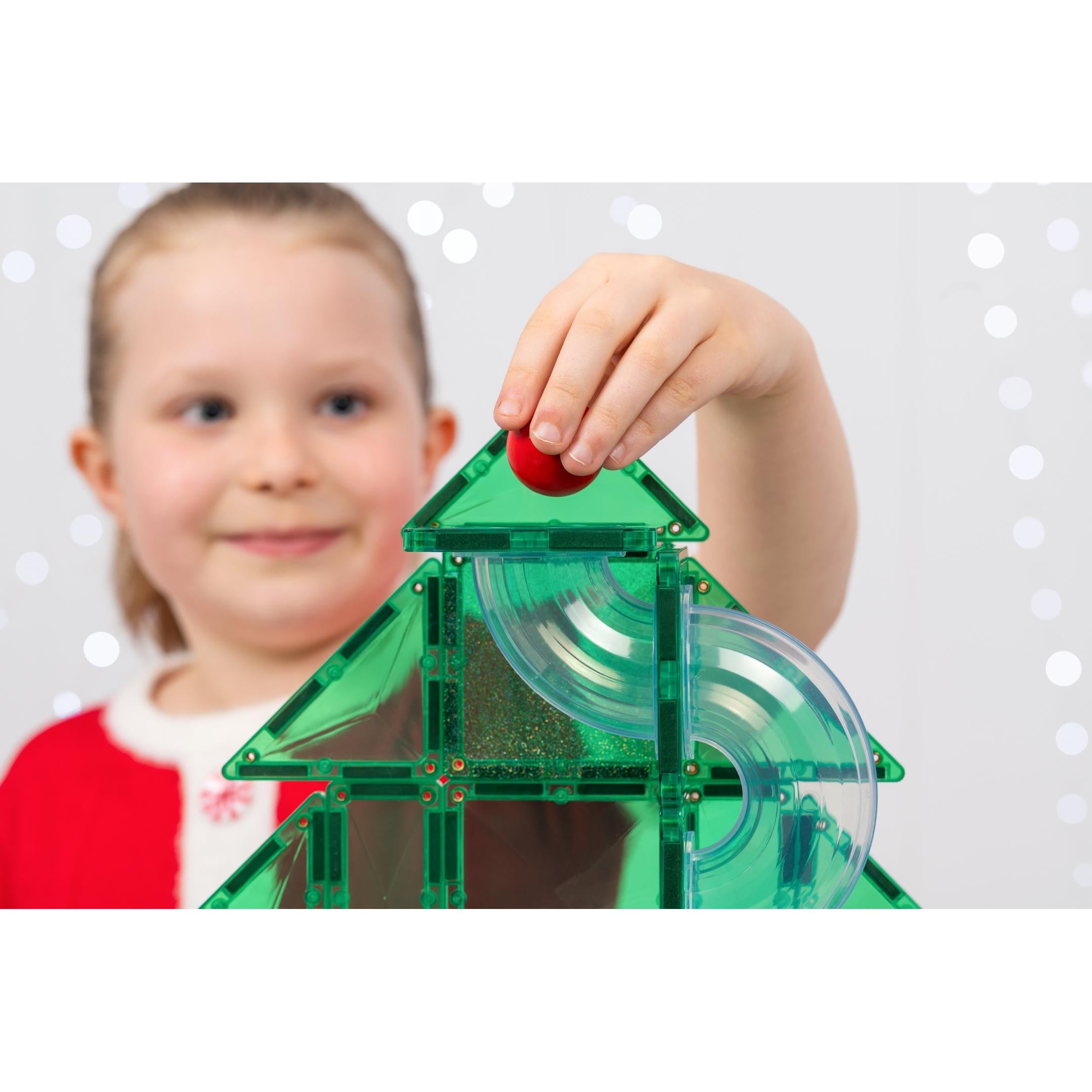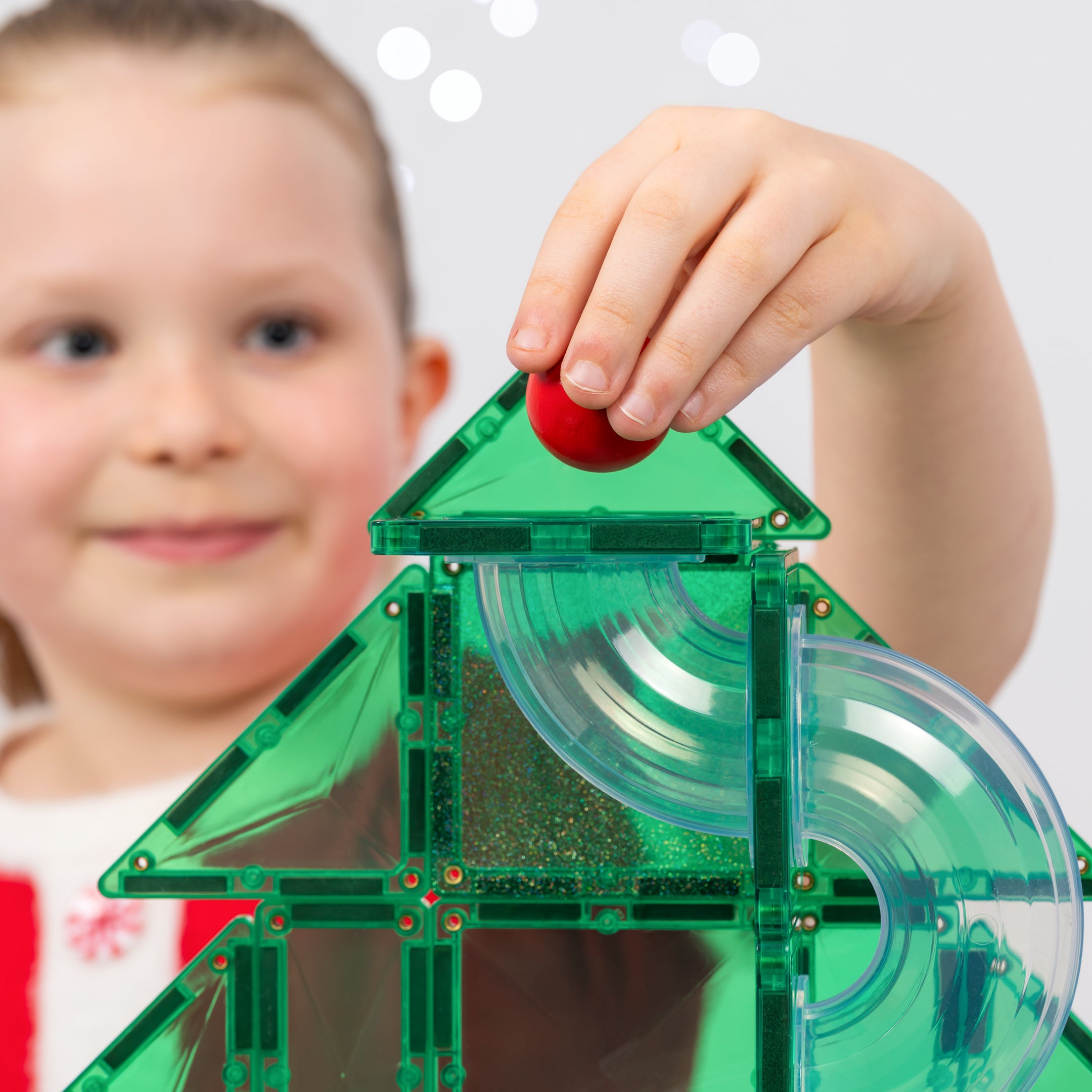 Unwrap hours of open-ended play and learning with Christmas Ball Run 71 piece FUN for everyone. This limited-edition pack features exclusively designed clear fluted tubes in an exciting range of pieces, including straights, slides and spirals to bring the joy of whirling, twirling ball run play this festive season. Showcasing a handpicked selection of magnetic tile shapes and connector squares in the traditional Christmas colours of green, red and yellow, plus adding a touch of magic with a combination of green glitter tiles this pack has everything you need to create a sparkling tree. Best of all, you can rebuild and enjoy it for years to come! Featuring four tactile wooden balls, watch as children unleash their inner engineer and team up with friends to race one another, build elaborate mazes, marble games, ramps and so much more ֖ this one-of-a-kind toy will provide hours of STEAM and MESH learning through play. Compatible with the entire CONNETIX range, this pack is the perfect gift to share the joy of limitless ball run fun or simply add to collections to take magnetic tile play in exciting, zooming directions.