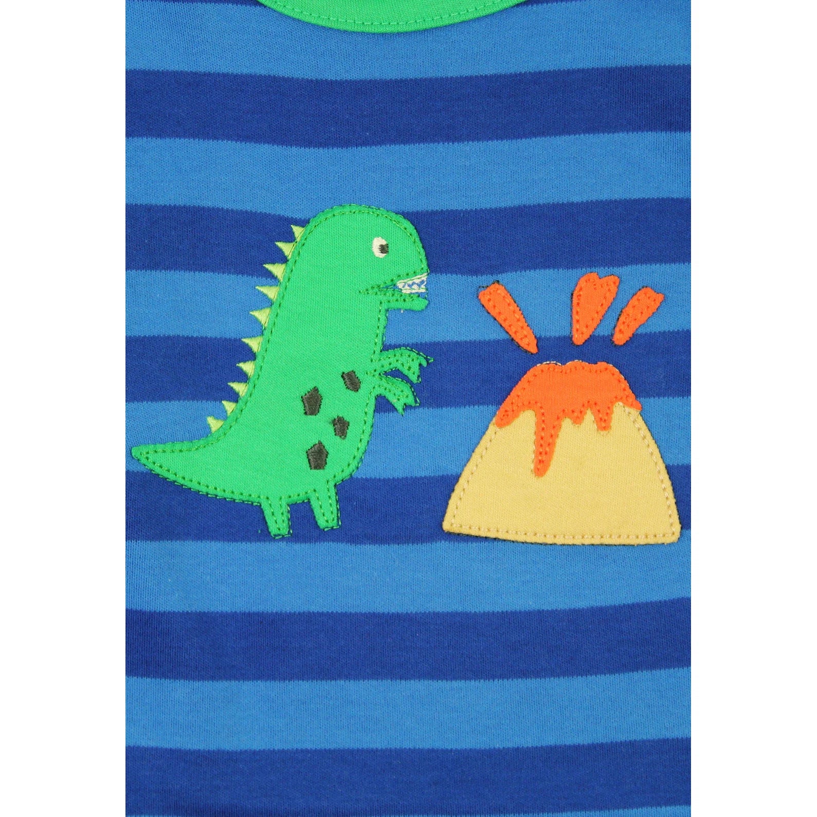 Roar with style in our Organic Blue Tonal Dinosaur Applique Long-Sleeved T-shirt! This playful shirt features a green t-rex and volcano applique, perfect for little dino fans. Made from organic materials, it's both eco-friendly and fun. Get ready to stomp and play!