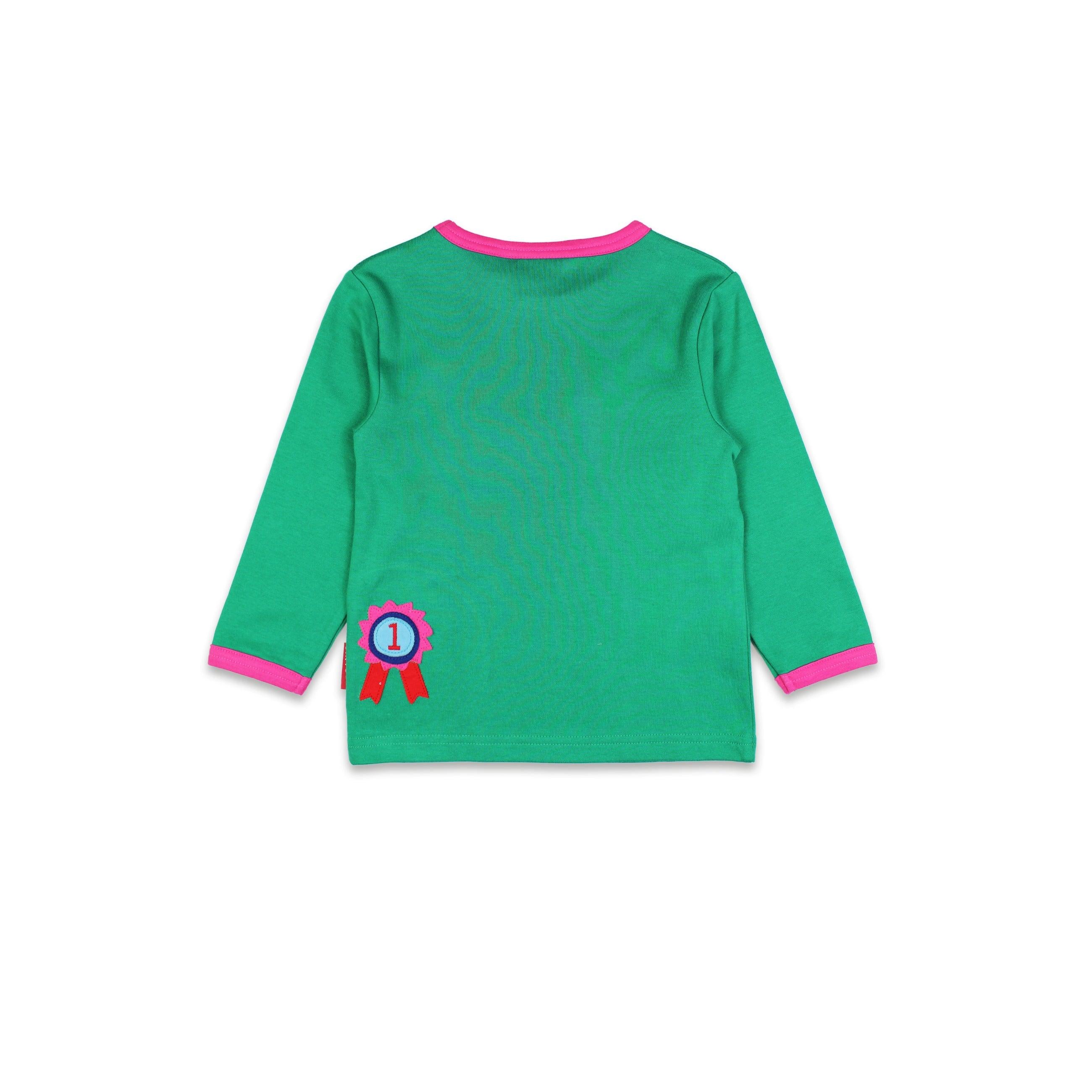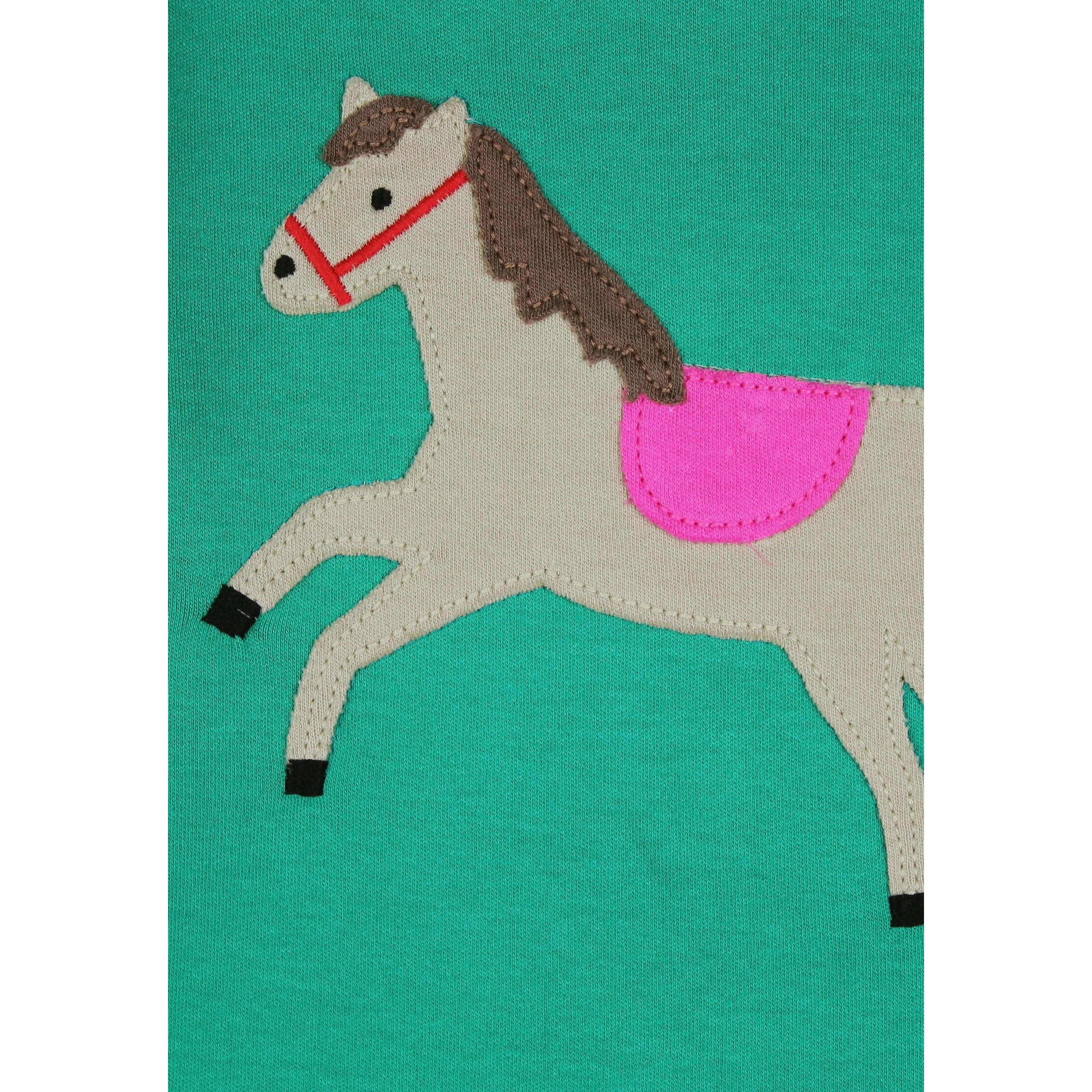 Saddle up for fun with our Organic Green Horse Applique Long-Sleeved T-Shirt! Crafted from soft, organic cotton, this vibrant green top features a spirited horse jumping applique on the front, while a No. 1 rosette graces the back for a winning touch.