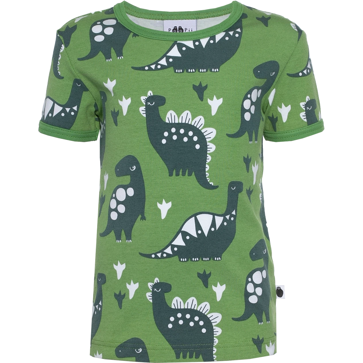 Paapii's green children's t-shirt in the shade of forest. The Visa t-shirt with a dinosaur pattern is fitted. This short-sleeved tricot shirt will delight you in everyday use. The timeless children's t-shirt is multi-purpose, and the pattern comes into its own. The garment is suitable for use all year round. The material of the children's clothing is flexible and comfortable organic cotton tricot.