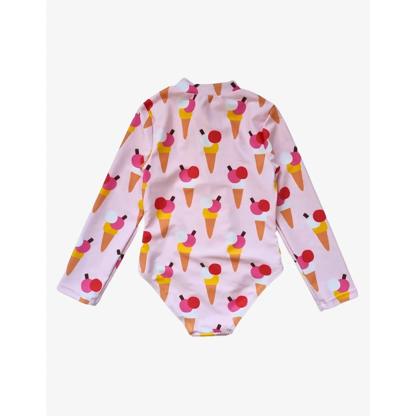 Get ready to make a splash with our Ice Cream Cones Print Long-Sleeved Swimsuit! Made from eco-friendly recycled polyester, this light pink swimming costume not only looks adorable with its ice cream print design but also offers UPF 50+ protection and features a durable YKK chunky plastic zip. Available in sizes 2-8 years old, your little one can enjoy the beach while being kind to the ocean.