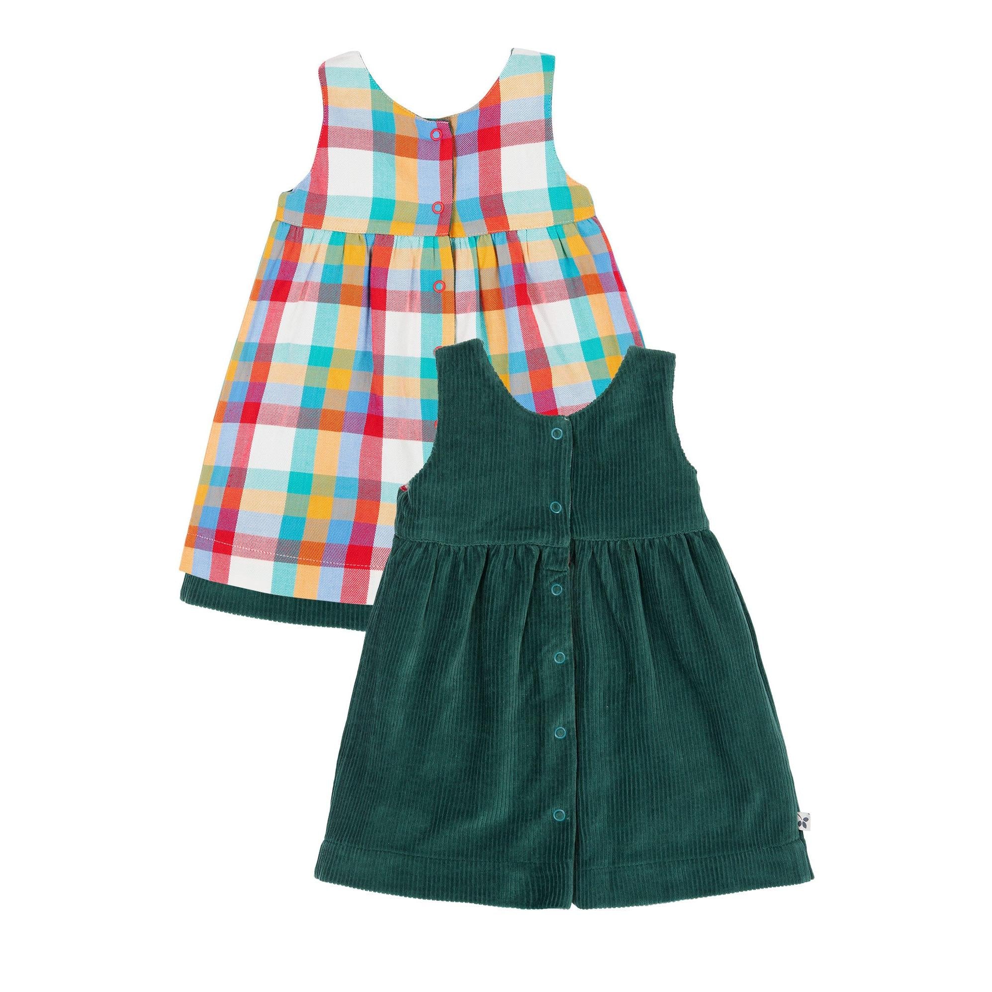 Why settle for one adorable outfit when you can have two? Our Rosalie Reversible Dress gives you just that – crafted from soft organic cotton, with a cosy cord side for snuggly days and a bright, patterned cotton side for extra pop and playfulness.