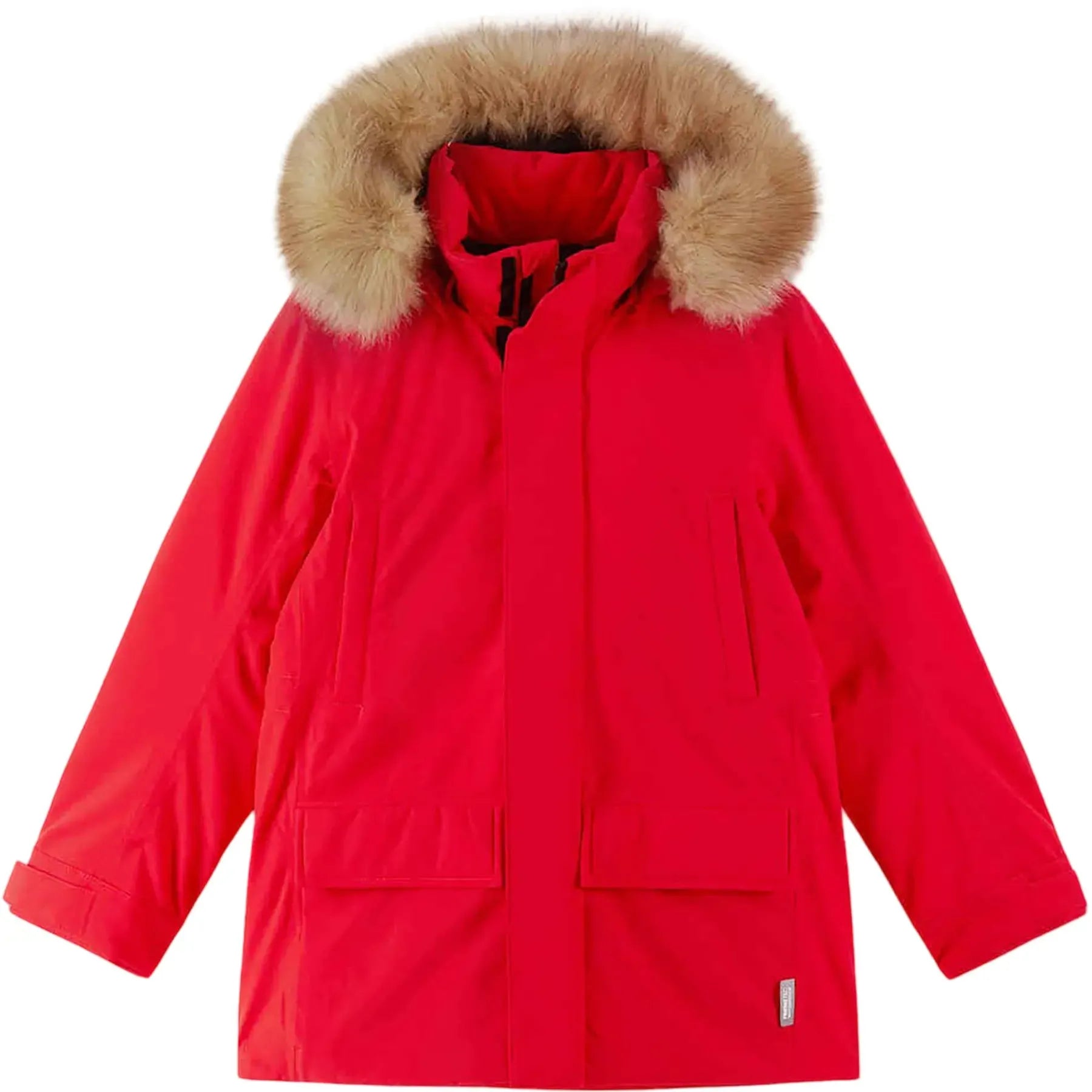 The junior waterproof down jacket Serkkula is your child's perfect companion for outdoor adventures. This windproof and waterproof jacket, with all seams sealed, repels water and dirt, ensuring your young one stays dry and clean. The down insulation offers warmth while the breathable shell material helps maintain comfort. The jacket comes with a safe, detachable hood adorned with faux fur, adjustable cuffs, and waist adjustments providing a snug fit. With multiple pockets including a zip pocket at the side, resting pockets, and flap pockets at front, your child has ample space for treasures. The longer style gives extra protection against elements.