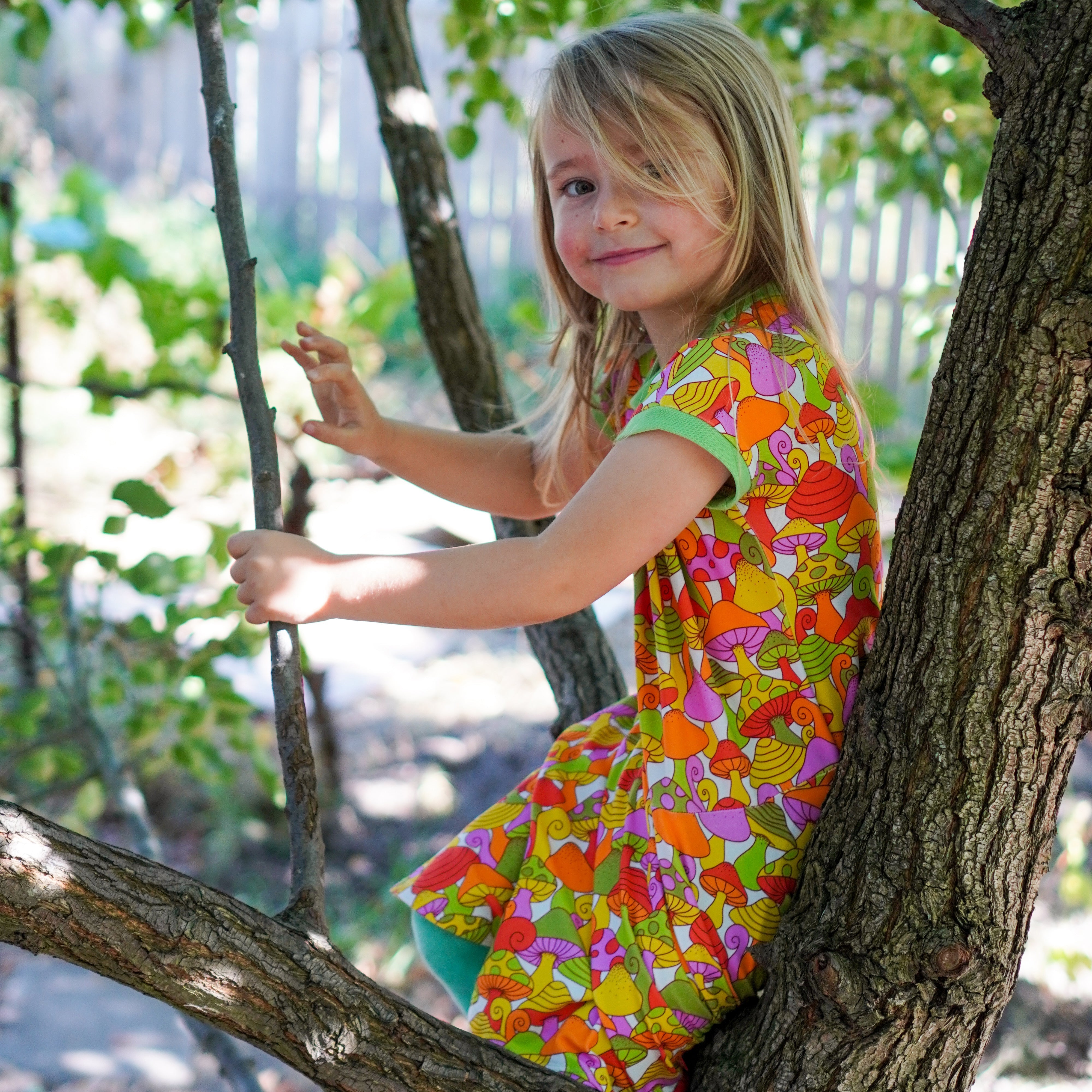 This stunning short sleeve dress comes in a vibrant print. Perfect for BIG adventures! Uddevalla Barn's dresses are all designed with longevity of wear and sustainability in mind.  As such they are a comfortable fit and should accompany your child on a year of growing and adventures.