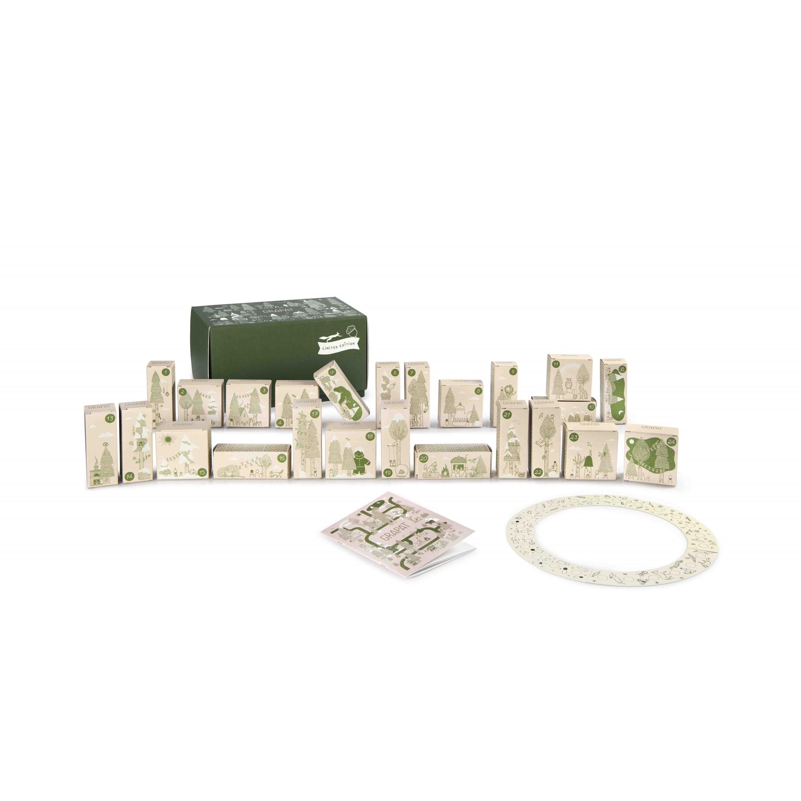 More than 180 pieces in different materials: wood, fabric, threads, wool, and much more. The box also includes a book with invitations to play, craft and share time together. In the box you can also find an original cardboard circle to be used as an advent crown countdown with some little dots you’ll find while the numbered boxes are opened day by day.